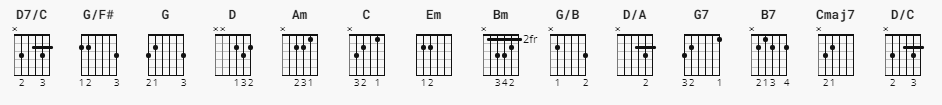 [Instrumental Break] * (G) G/F# Em Bm Bm G G/F# Em Bm Bm G G/F# Em Bm D * * [Chorus] D/C G It's not too late G7 C B7 Em Either way, I lose you in these silent days G It wasn't right N.C. D D7/C G But it was right on time * * [NOTES] D7/C = x30212 G/F# = 2x000x * Chords in Instrumental Break represent two beats except G (one and a half) plus eighth note G/F# passing chord. End with one beat of D and one beat of D/C into chorus. |