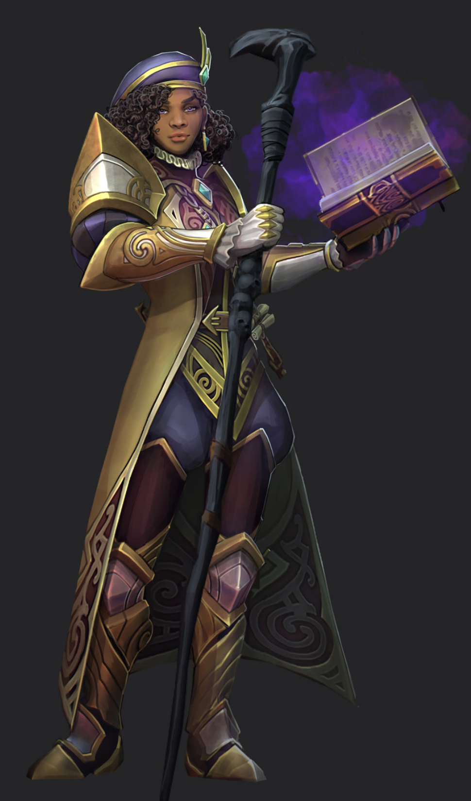 Vajra Safahr, holding the Blackstaff, a spellbook, and wearing her arcane robes.