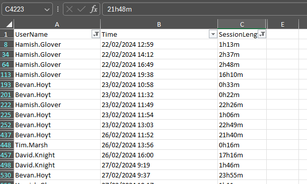 Calculating Session Length: For logoff events (event ID 4624), it looks for the next logon event for the same user and calculates the session length by subtracting the logon time from the logoff time. It uses the