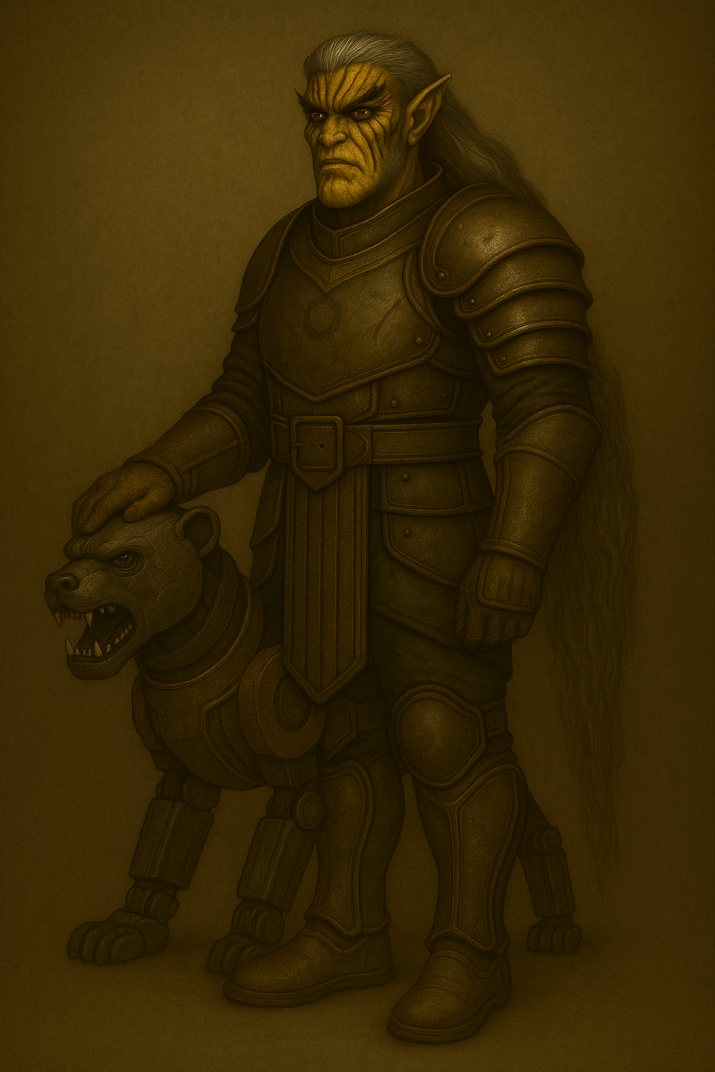 - Wears reinforced half-plate armor, etched with arcane script and battle scars.