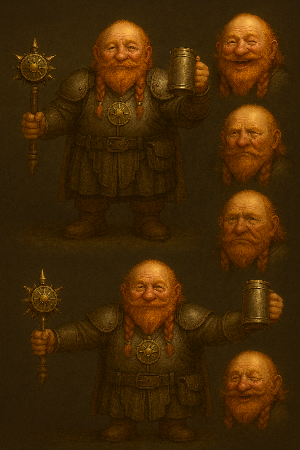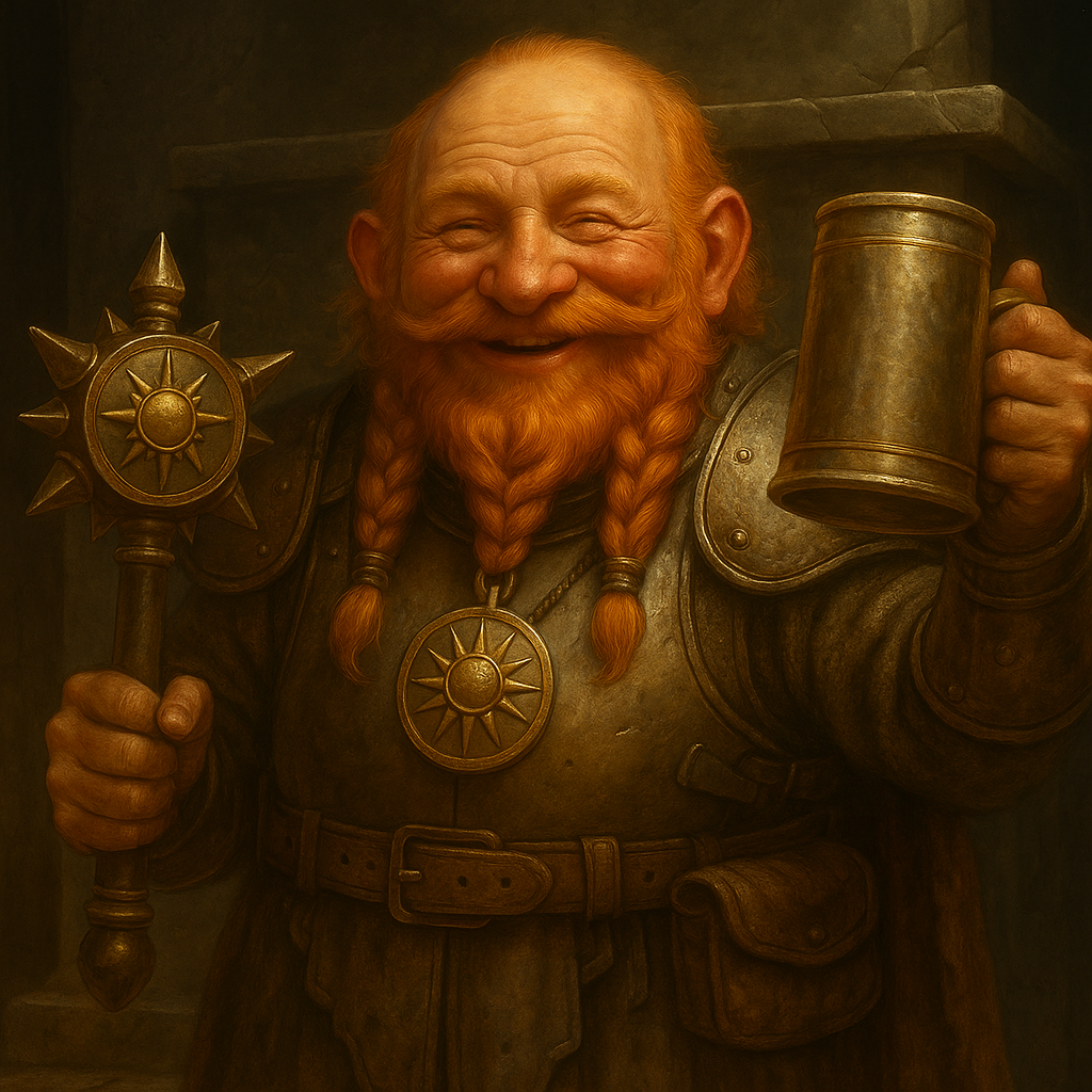 Leydrick is a stout, solidly-built dwarf with a bushy copper beard braided simply, bearing streaks of ash and silver. His armor is functional but heavy, designed more for practical survival than pageantry—scuffed from travel and crusted in soot from long nights by the campfire. His mace hangs visibly at his side, a blunt instrument of healing justice. His eyes, a soft storm-grey, rarely betray urgency, reflecting a calm forged from years of wagon-bound travel.