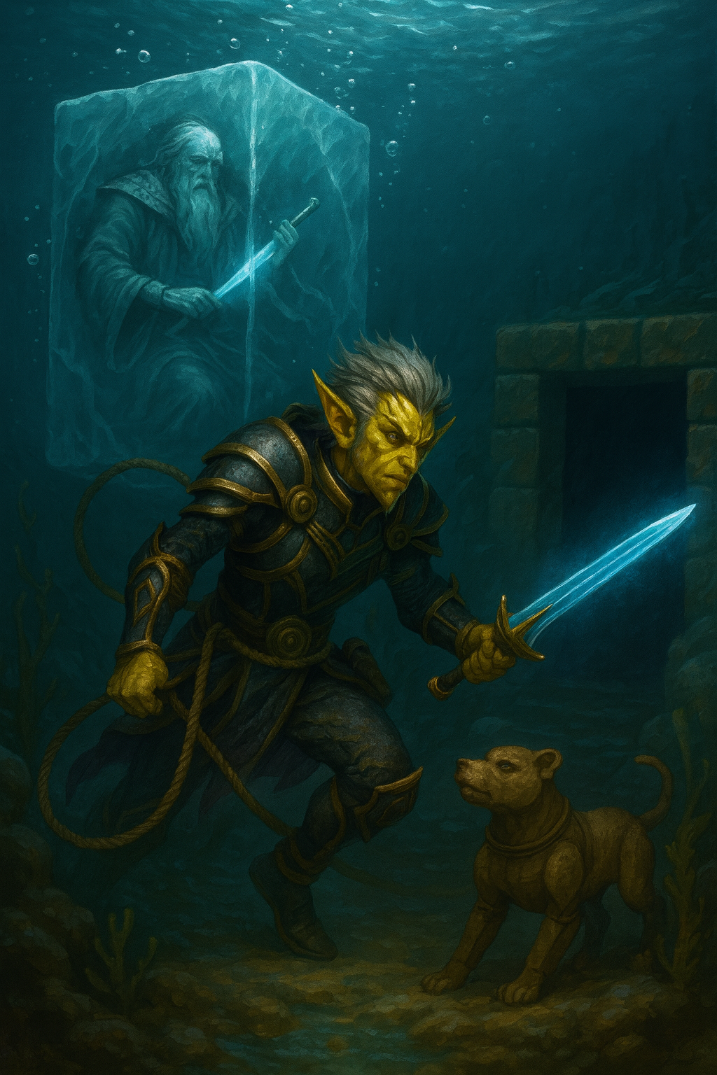 Beneath a vast underwater expanse, Dino Roar swims with a rope tied to his waist, straining as he psychically pulls a 15-foot cube of ice closer. Inside the block lies the corpse of a wizard clutching a Wand of Frost. Dim light filters through the water, illuminating his Steel Defender construct perched anxiously at the portal’s edge.
