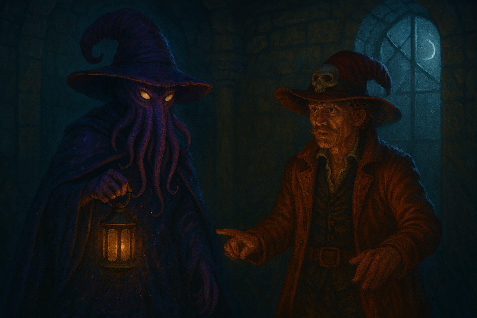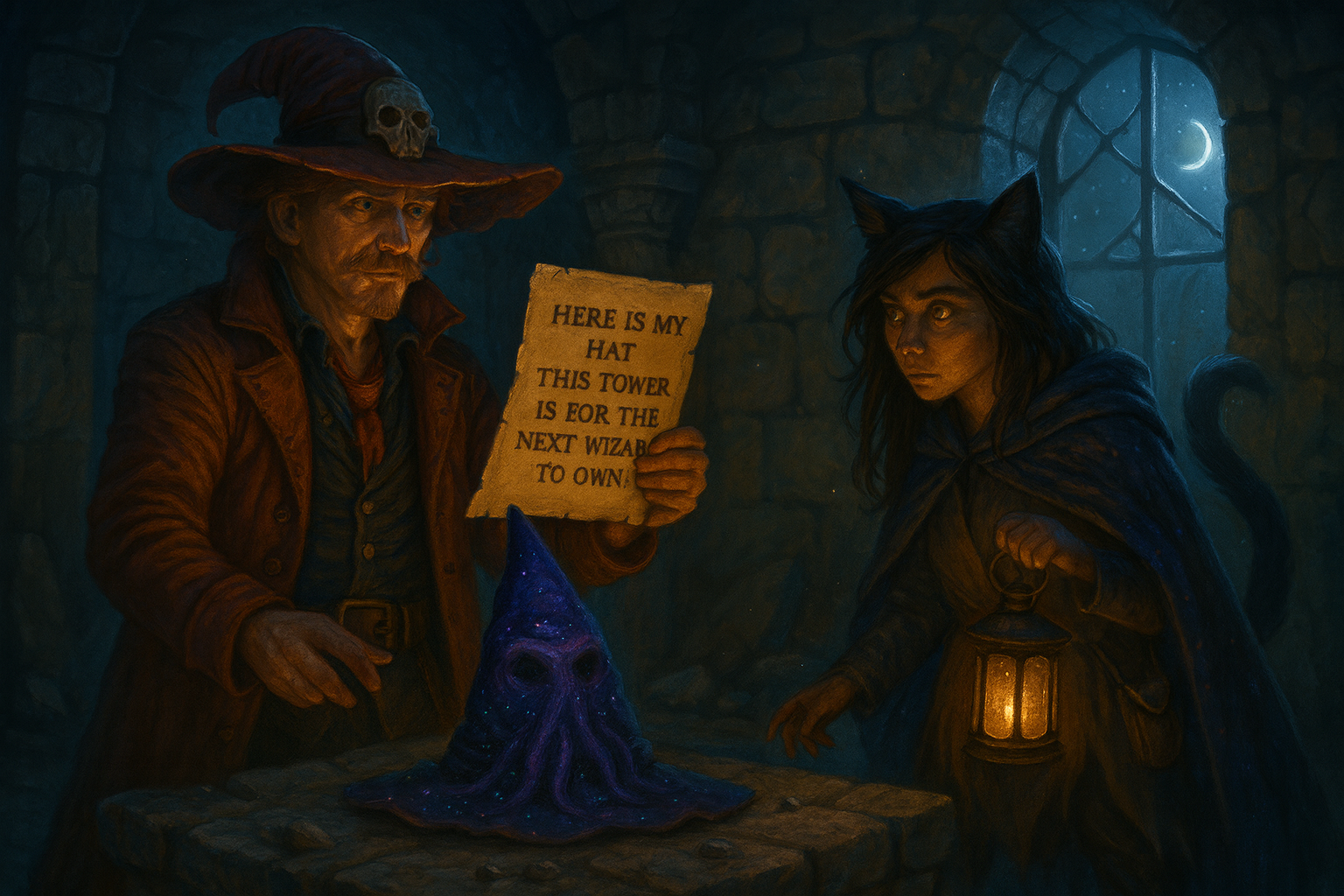 Valen and High Jinx : Inside the ruined wizard’s tower, Valen Pyre holds up an old parchment that reads “Here is my hat, this tower is for the next wizard to own.” At his feet lies a pointed wizard’s hat shimmering with illusion, making the wearer resemble a mind flayer. High Jinks eyes the hat warily, tail twitching, silver moonlight pouring through a cracked window.