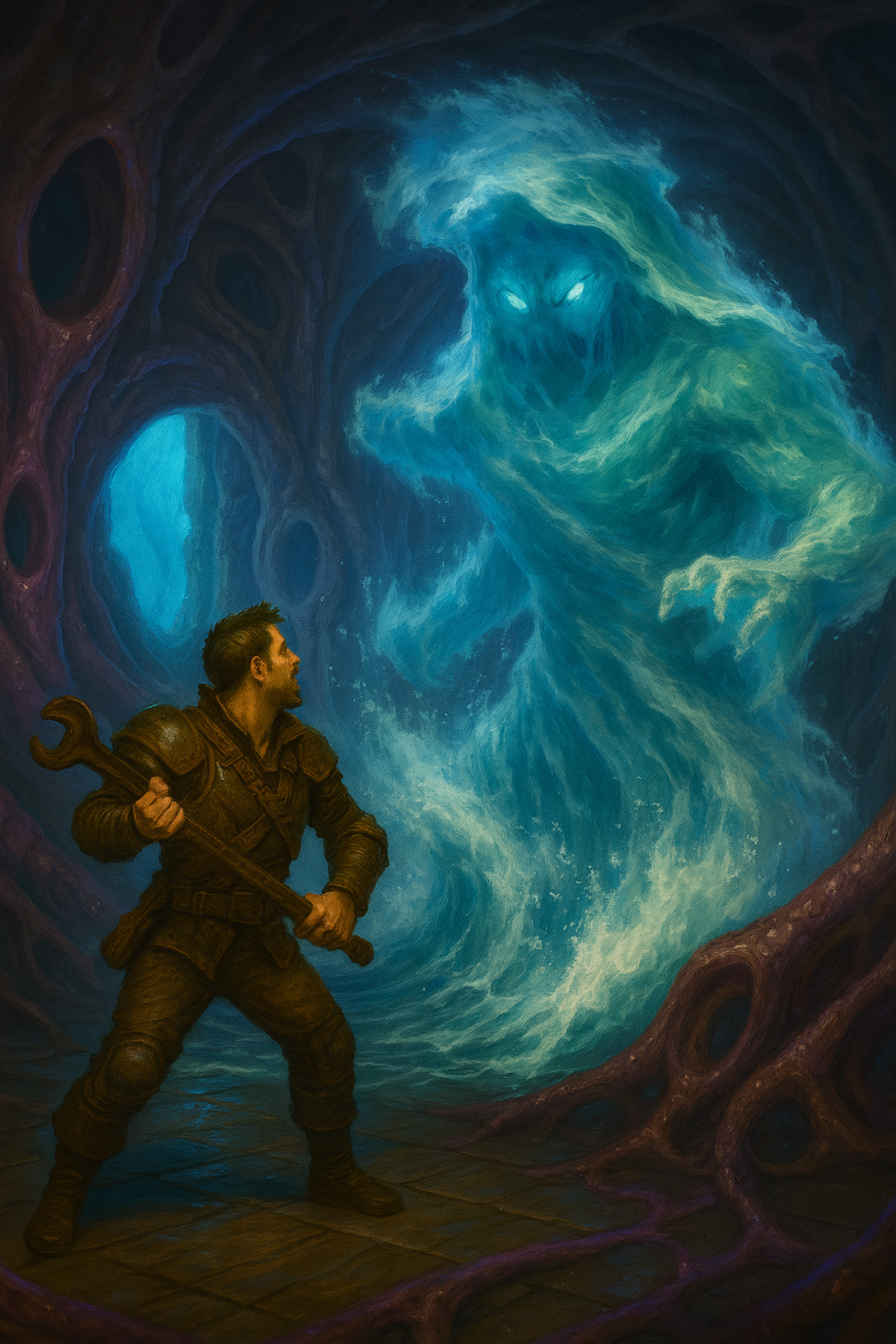 A water elemental surges through the blue portal onto the nautiloid ship’s deck, spraying seawater across alien tentacle-like walls. Garrick “Rigg” Dalhart braces himself mid-swing, ready to strike. The elemental towers above him, coiled waves forming a humanoid shape, glowing eyes fixed on its prey.