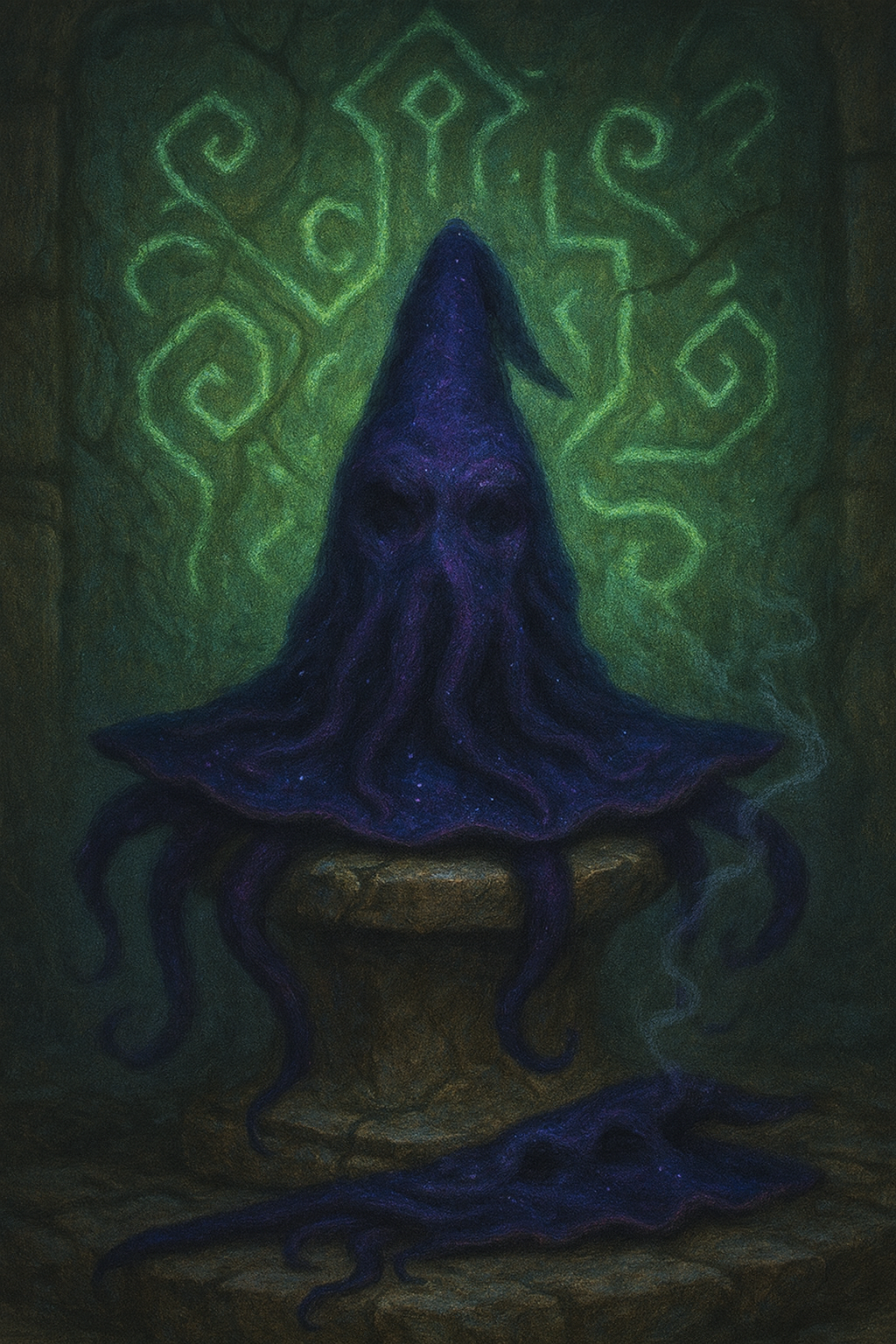 Picking up from Session 10, the party chose to go up the tower first. In the upper room, a hat and a note awaited: the former owner left the tower “for the next wizard to own.” Valen claimed the tower. The hat, when worn, makes the wearer appear as a mind flayer—Jinks tried it and kept it.