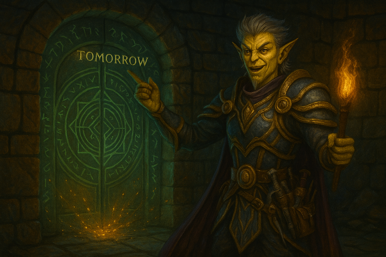 In the torchlit stone basement, Dino Roar stands before a glowing green-sigil door. Arcane runes shimmer as he confidently speaks the word “Tomorrow.” The stone door parts open, revealing faint gleams of treasure within, while magical sparks scatter across the floor.