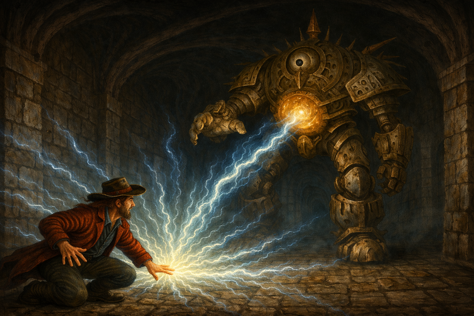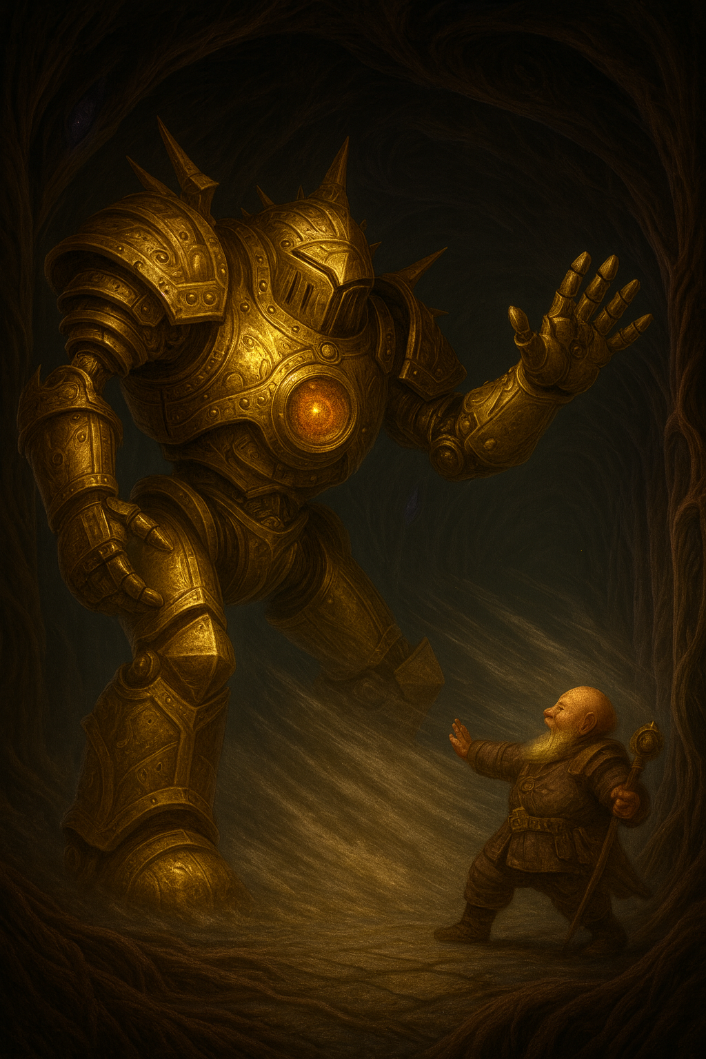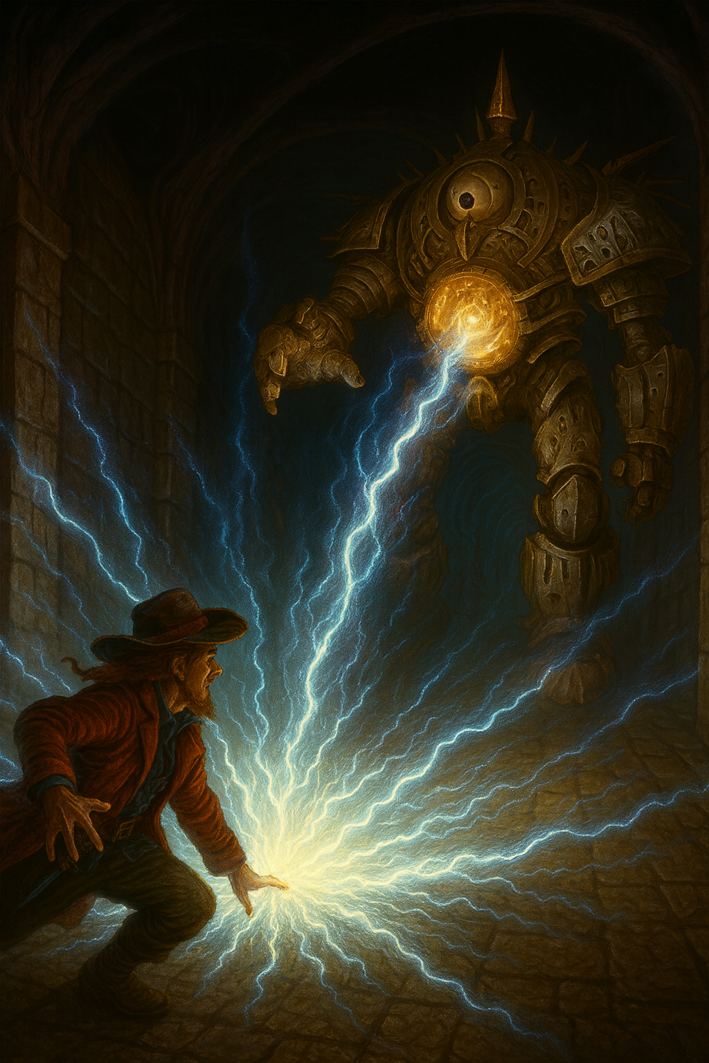 Upon reboarding the ship, a colossal golden construct pushed through the corridor, declaring the party unauthorized. Combat erupted in tight quarters, but spellfire and steel barely slowed it. Each failed Charisma save resulted in a character vanishing.