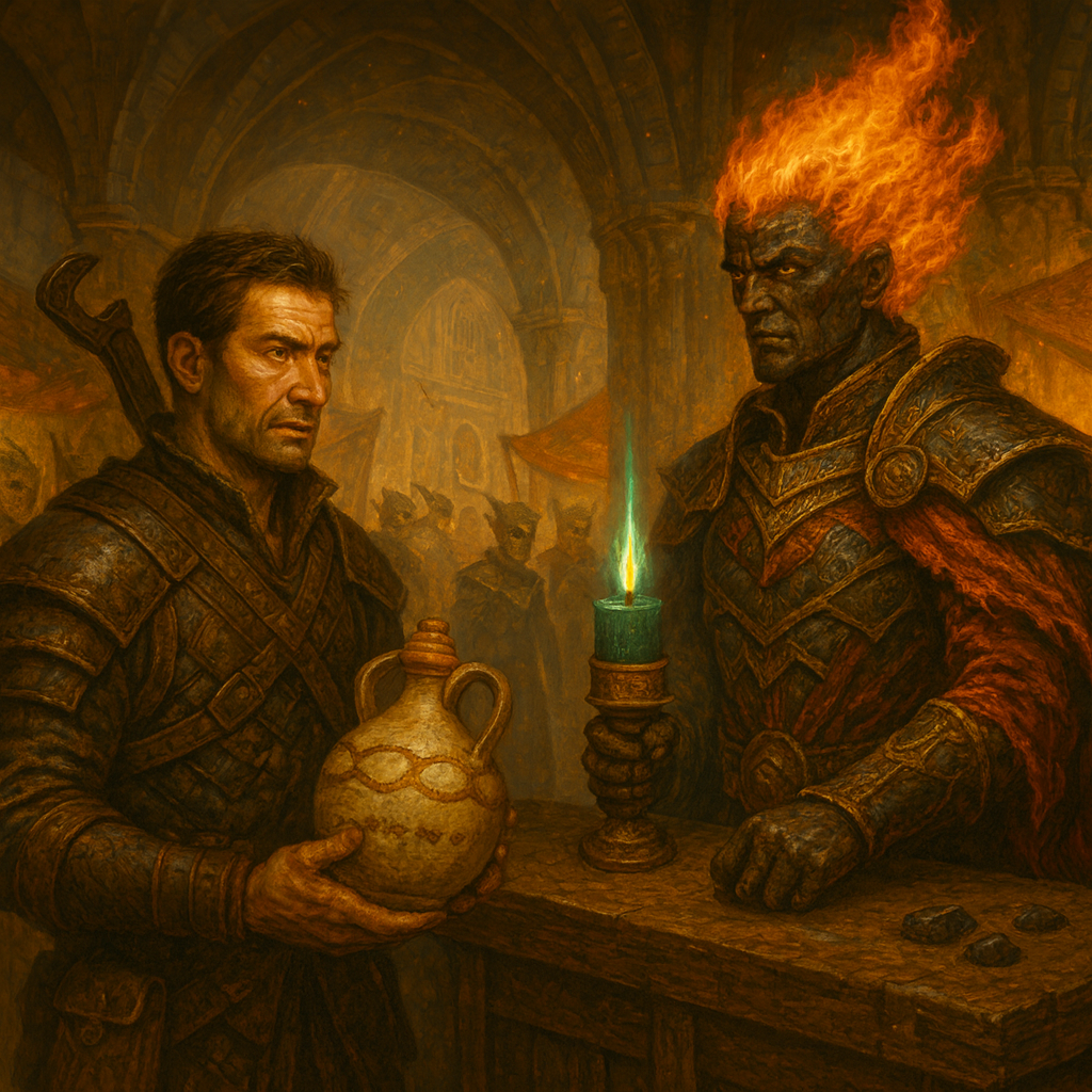 The party browsed the bustling Githyanki bazaar, where Keshari displayed fire-touched wares. Rigg secured an Alchemy Jug and candle while the others found drinks and gathered information.