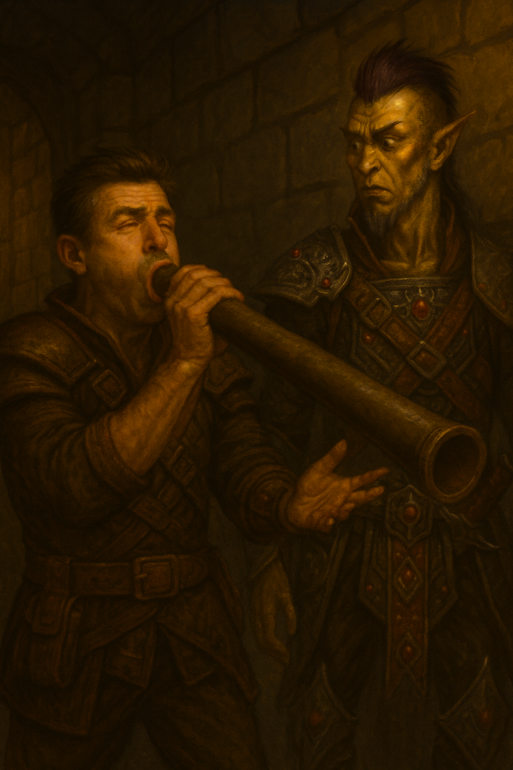 Rook insisted they retrieve his confiscated gear. Rigg distracted a nearby guard using improvised didgeridoo noises while looking for it. When stopped by the prison captain, Rigg attempted a story about essential “medication” in Rook’s belongings. The captain was unmoved but offered the gear for 50 gold. Rigg paid the bribe, securing Rook’s equipment.