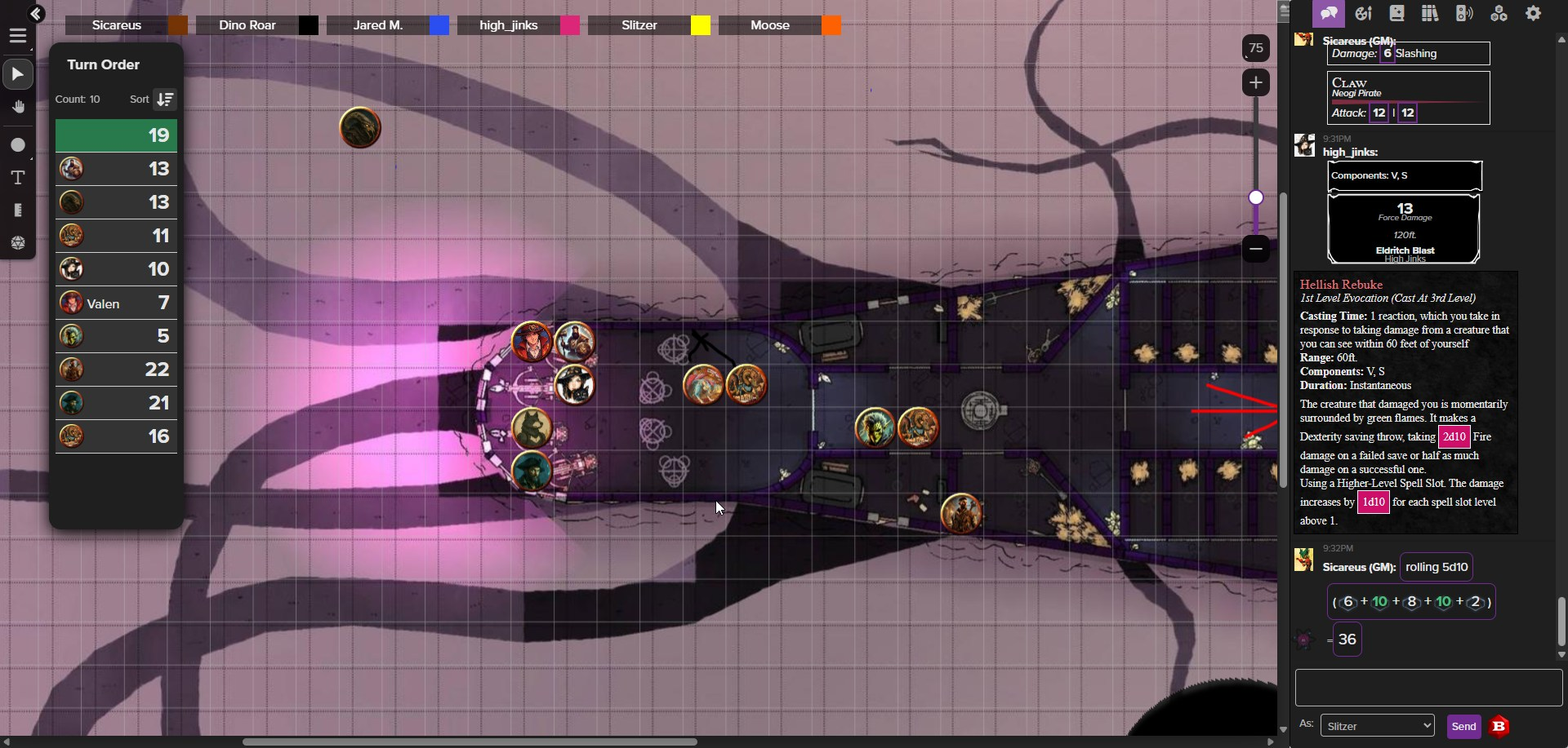 Fireball opening strike; Thunder Step; revived Leydrick; final Eldritch Blast kill |