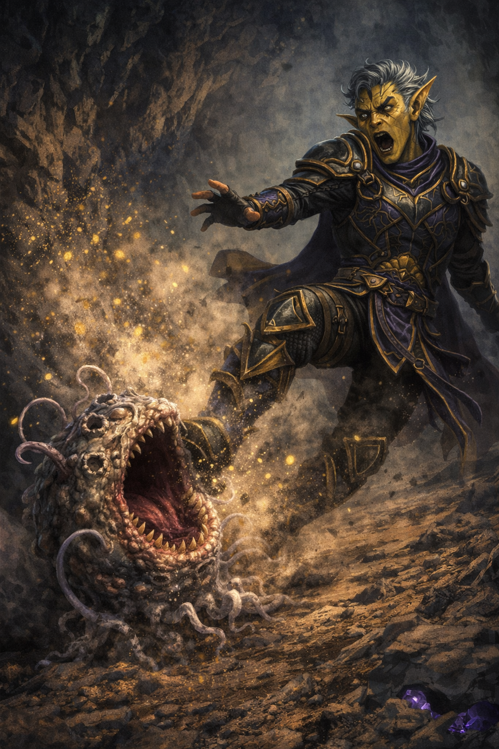 When the spores finally thinned, the Underdark immediately reminded them why caution exists: Dino kicked what looked like a harmless rock, and it screamed. The noise drew four Hook Horrors, and the party cut them down with coordinated force — fireball, sacred flame, eldritch blasts, wrench work, and Rook’s rapier. Moments later, a new threat announced itself with sound before sight: a deep buzzing in the darkness. The group sprinted until it faded behind them… straight into the path of something worse — a chained carriage dragged by two massive skeletal beasts, surrounded by shadow-like guards, with a lone figure seated inside. Valen launched his last Fireball. It was counterspelled into nothing. Dino, committed to the worst-good idea, cast Heroism and jumped onto the carriage as the session ended.