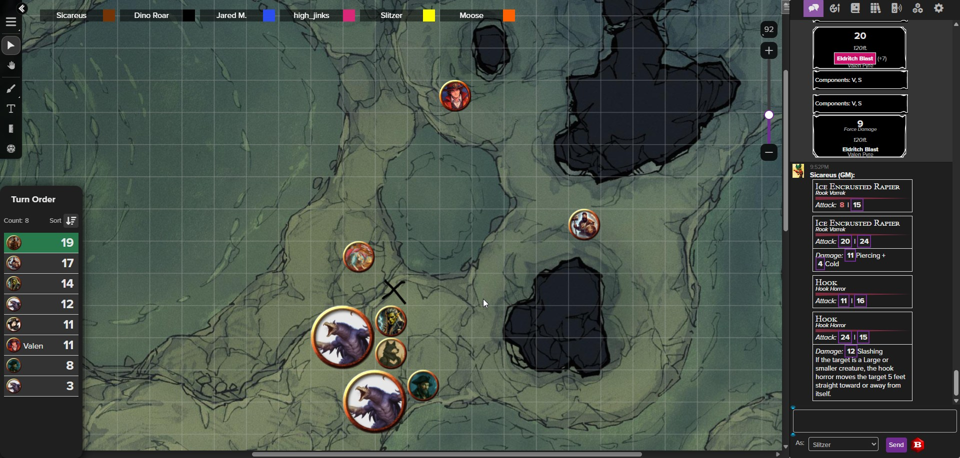- The party won the Hook Horror fight decisively: Fireball, Sacred Flame, Eldritch Blast, poison, familiar stings, and melee work.