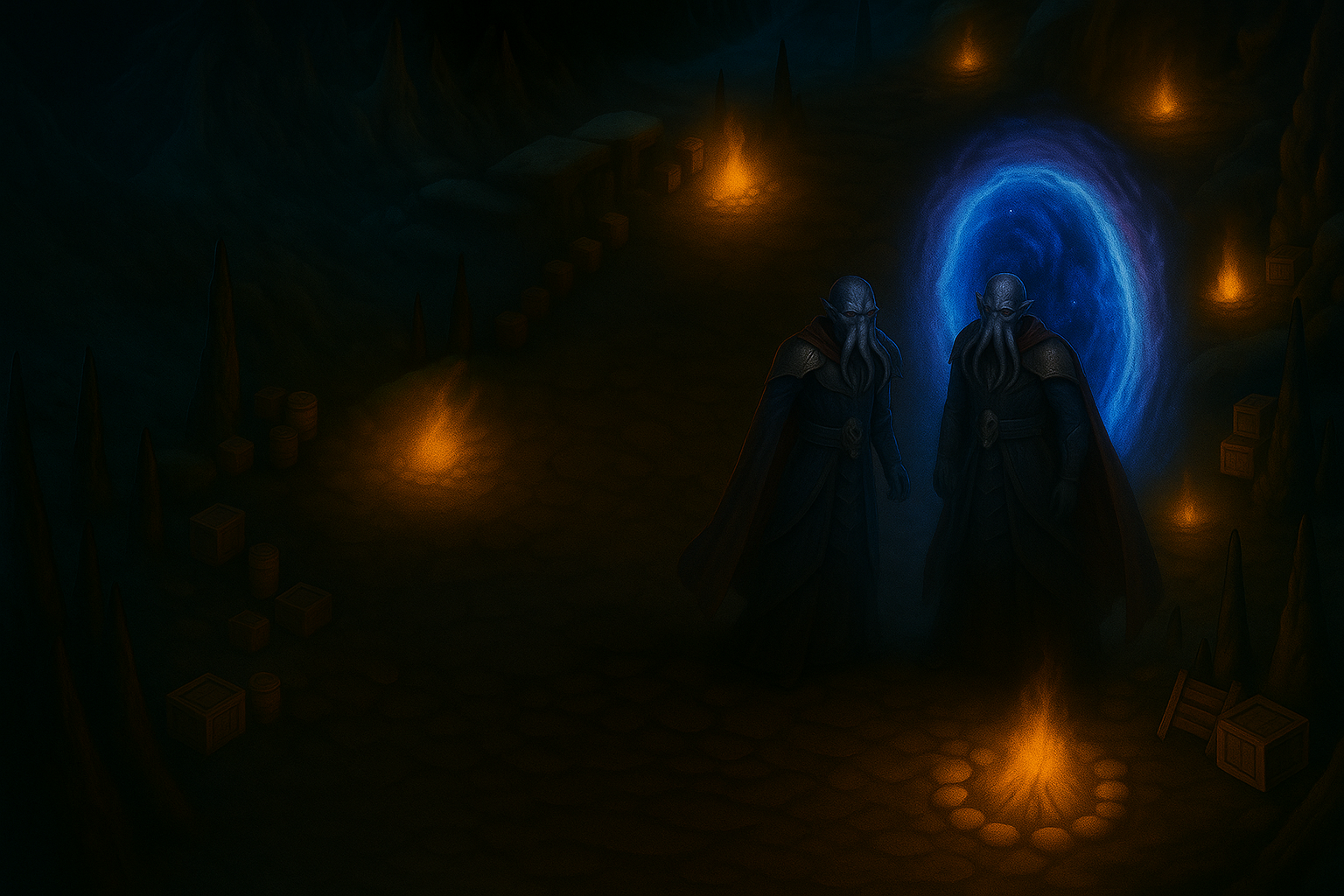 - Drow escort: After a short rest, the scouts led the party to a broad, well-lit cavern where a glowing portal pulsed at the far wall; two Mind-Flayers stood chanting beside it.