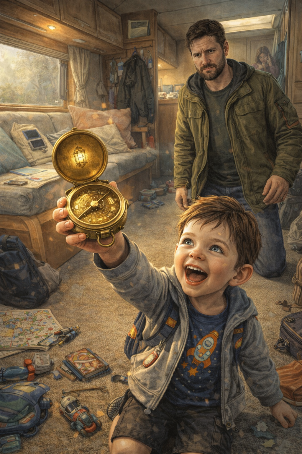 The caravan smelled faintly of cold upholstery, plastic containers, and the lemon wipes Mum always used before trips. Oakley was kneeling on the floor by the dinette seat with one arm buried in the storage compartment.