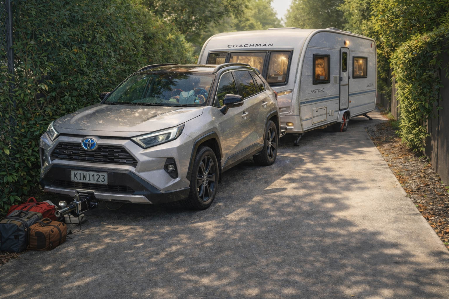 Outside, the silver RAV4 sat in the driveway with the Coachman Pastiche caravan hitched behind it, both of them damp with the kind of South Island morning mist that made everything look as if it had not quite woken up yet.
