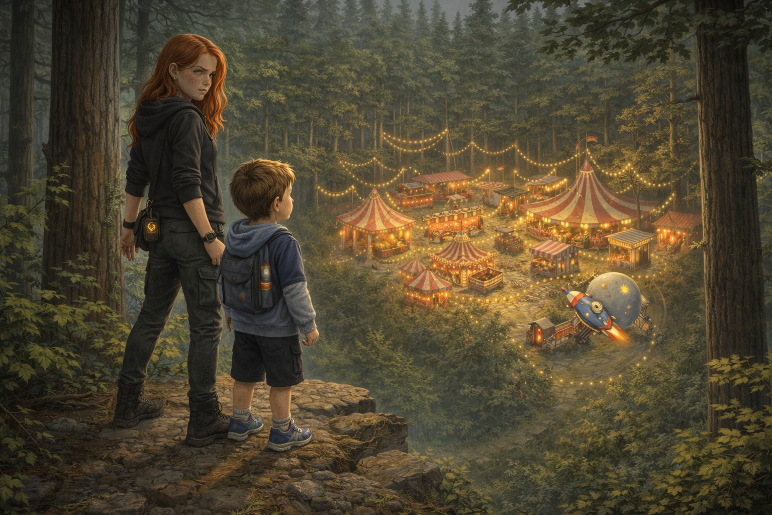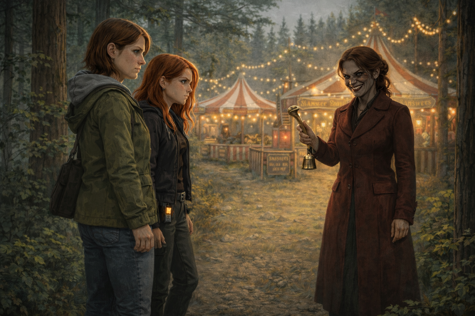 A stall appeared between the pines ten meters later and was gone when Dad blinked. Ivy had still seen it clearly enough: striped roof, shelves of prizes, rows of little glass jars each holding something that moved like trapped smoke.