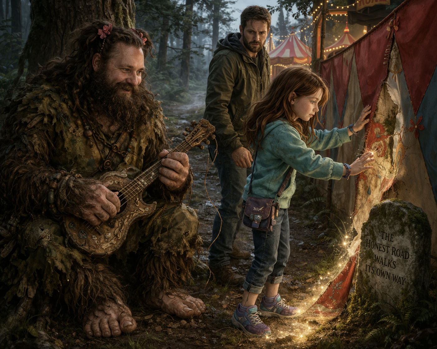 Dad let out a breath through his nose. “You arrived sitting on a stump with a haunted guitar beside an evil carnival.”