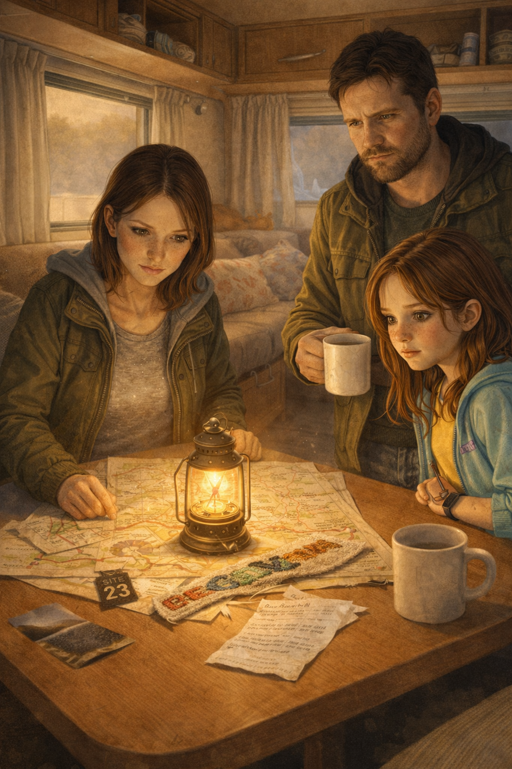 Dad stood over the little table with a mug of tea gone cold in one hand and the map spread open under the other. The route-strip lay across it like a narrow old scar. The Site 23 tag sat where Ivy had put it. The Lantern Compass rested at the top of the page, still and watchful.