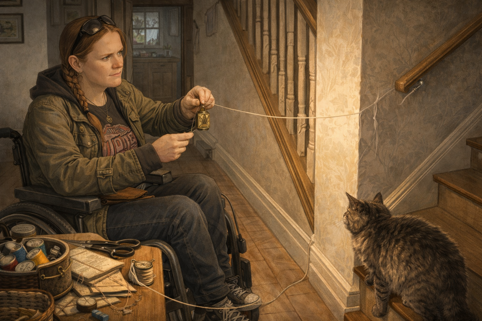 “Still here.” The phone view juddered, then settled. Erin had stitched nothing, exactly, but she had looped the cream thread across the corner bracket of a shelf and around the old newel post at the base of the stairs, making a taut little line that looked absurdly domestic and weirdly right. “There. It hates joins, so it can dislike mine instead.”