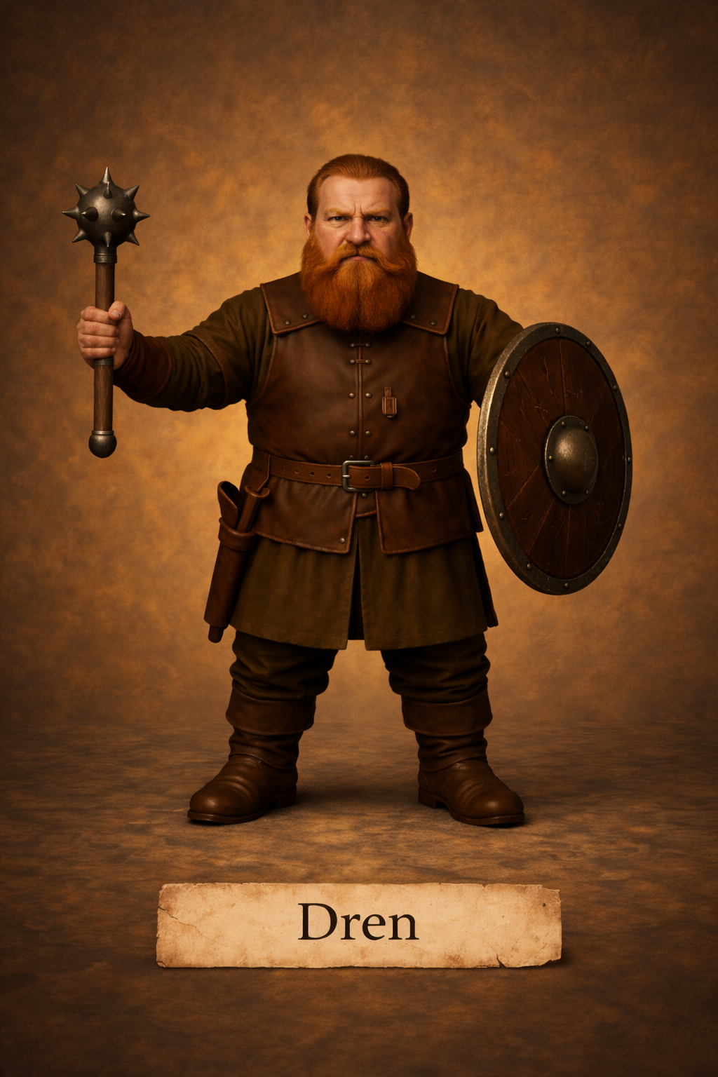 - Session 1 — The brain-eaten incident: Dren was found being tortured in the sewers alongside Floon Blagmaar (torturers included a wizard, a Mind Flayer, and an Intellect Devourer). The Intellect Devourer consumed Dren’s brain, incapacitating him.